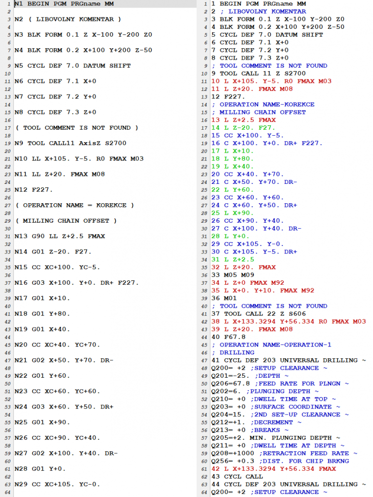 Um den richtigen NC-Code zu generieren, haben wir das ISO-Format eingestellt und spezielle Sequenzen hinzugefügt. Wir haben auch eine universelle Anwendung für die spätere Änderung des generierten Codes erstellt. Mit der Anwendung können Sie die Sequenzen, die wir in vordefinierte Zeichenfolgen einfügen, ändern und den NC-Code gemäß den festgelegten Regeln vollständig neu formatieren. Sie können sowohl Text- als auch Zahlenwerte im Code für eine beliebige Anzahl von NC-Codeblöcken leicht ändern.